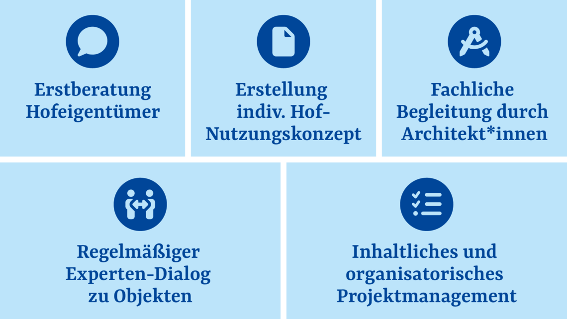 Das Projekt umfasste fünf Bausteine. Ihr Zusammenspiel ermöglichte eine ganzheitliche und zielgerichtete Betrachtung der Gebäude und fachliche Begleitung der Eigentümer und Eigentümerinnen, von der Idee bis zur konkreten Umsetzungsplanung.